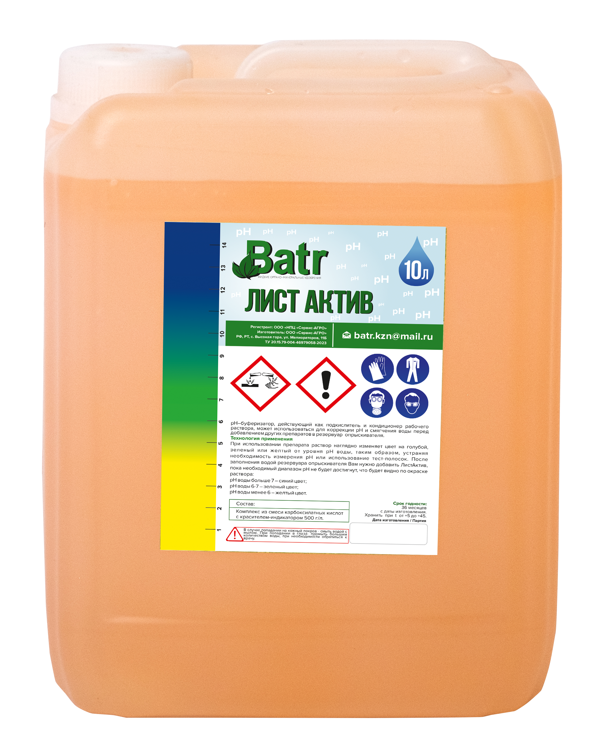 Batr «ЛИСТАКТИВ» – р H–буферизатор, действующий как подкислитель и кондиционер рабочего раствора, используется для коррекции рН и смягчения воды перед добавлением других препаратов в резервуар опрыскивателя.