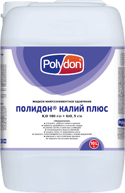 Полидон Калий Плюс - Состав с высоким содержанием калия, фосфора (в виде дифосфоновой кислоты) и кремния в хелатной форме. Применяется на всех сельскохозяйственных культурах в критические периоды роста и развития. Разработан для совместного использования в баковых смесях с гербицидами имидазолиновой группы, глифосатами. Вносится совместно с пестицидами и растворами минеральных удобрений.