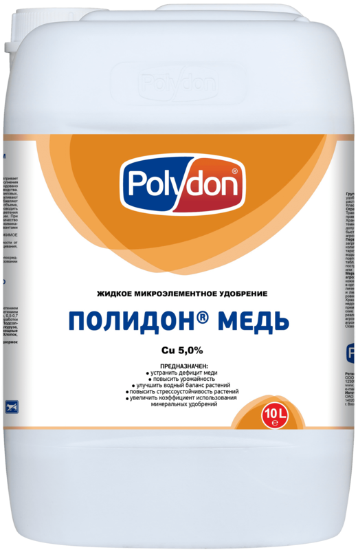 Полидон Медь - Состав с высоким содержанием меди в этаноламиновом комплексе. Применяется на всех сельскохозяйственных культурах в критические периоды роста и развития. Вносится совместно с пестицидами и растворами минеральных удобрений.