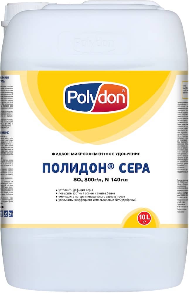 Полидон Сера - Состав с высоким содержанием серы в виде раствора тиосульфата аммония. Применяется на всех сельскохозяйственных культурах в критические периоды роста и развития. Вносится совместно с пестицидами и растворами минеральных удобрений.