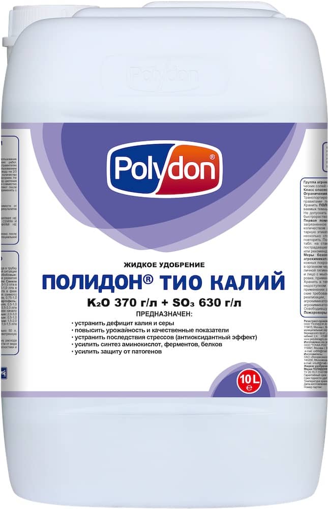 Полидон ТИО Калий- Питательный минеральный комплекс с высоким содержанием калия и серы готов к использованию на всех сельскохозяйственных культурах в критические периоды роста и развития. Технология применения агрохимиката Полидон ТИО Калий предусматривает использование типовых технических средств, предназначенных для выполнения агрохимических работ. Предпосевную обработку семян рекомендовано проводить путем инкрустации в протравителях промышленного производства. Некорневые подкормки рекомендовано проводить с использованием штанговых, вентиляторных, ранцевых опрыскивателей. В бак опрыскивателя наливают воду на 2/3 объема, при включенном перемешивающем устройстве добавляют необходимое количество удобрения, доливают воду до расчетного объема, раствор перемешивают и проводят подкормки. Не рекомендуется проводить некорневые подкормки в жаркую солнечную погоду и в период цветения культуры, в период, когда растения находятся в стрессовой ситуации.