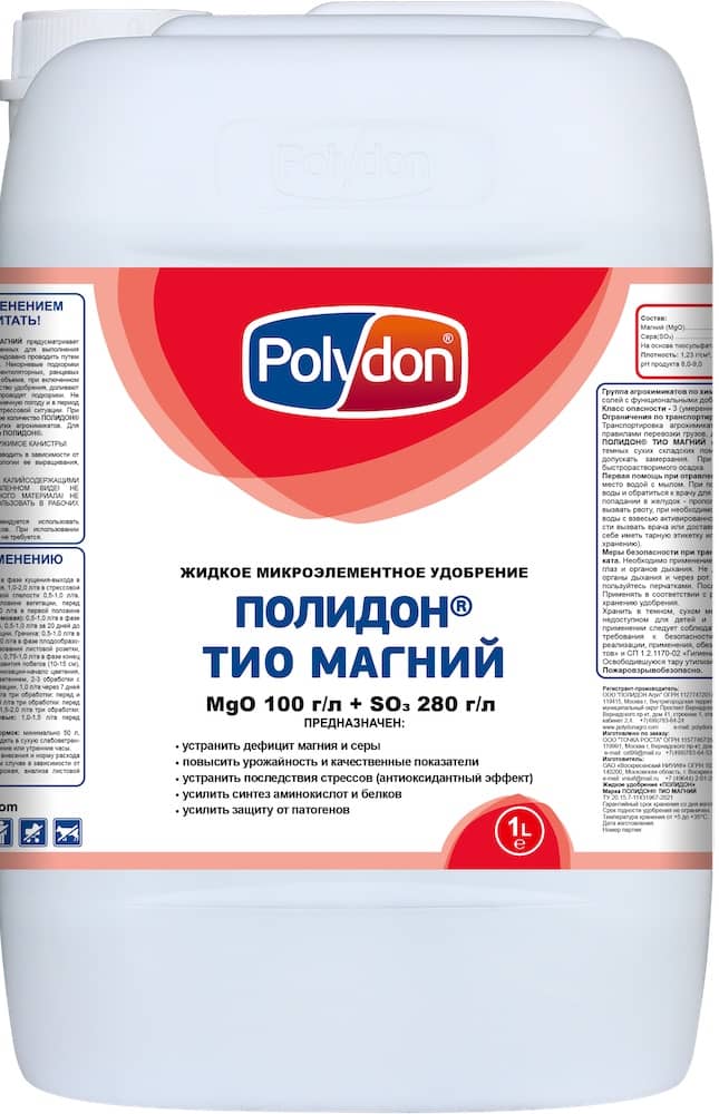 Полидон ТИО Магний - Питательный минеральный комплекс с высоким содержанием магния и серы готов к использованию на всех сельскохозяйственных культурах в критические периоды роста и развития. Технология применения агрохимиката Полидон ТИО Магний предусматривает использование типовых технических средств, предназначенных для выполнения агрохимических работ. Предпосевную обработку семян рекомендовано проводить путем инкрустации в протравителях промышленного производства.