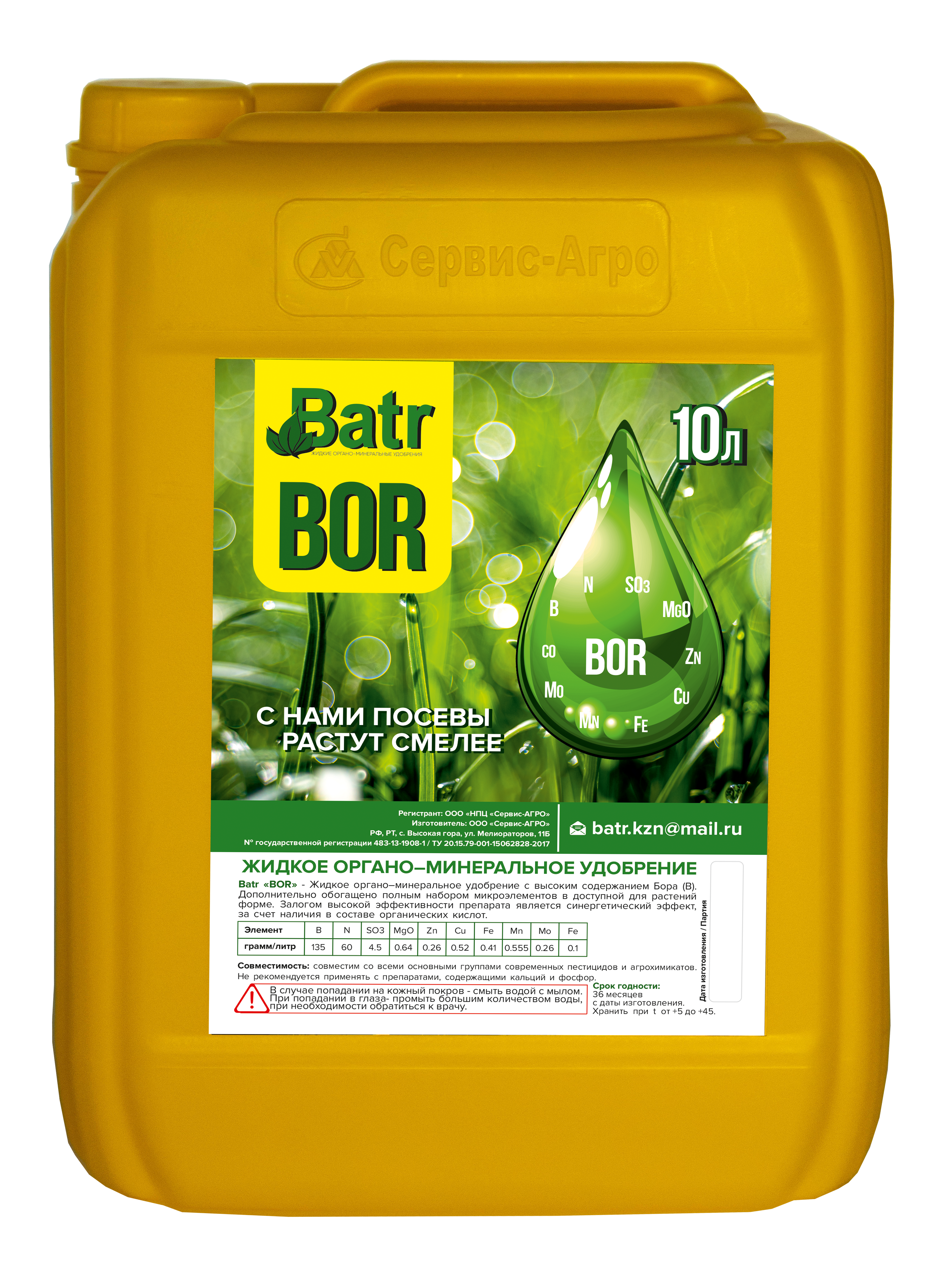 Batr «BOR» - жидкое органо–минеральное удобрение с высоким содержанием Бора (В). Дополнительно обогащено полным набором микроэлементов в доступной для растений форме. Залогом высокой эффективности препарата является синергетический эффект, за счет наличия в составе комплекса органических кислот (янтарная, лимонная, аскорбиновая). Совместим со всеми основными группами современных пестицидов и агрохимикатов. Не рекомендуется применять с препаратами, содержащими кальций и фосфор.