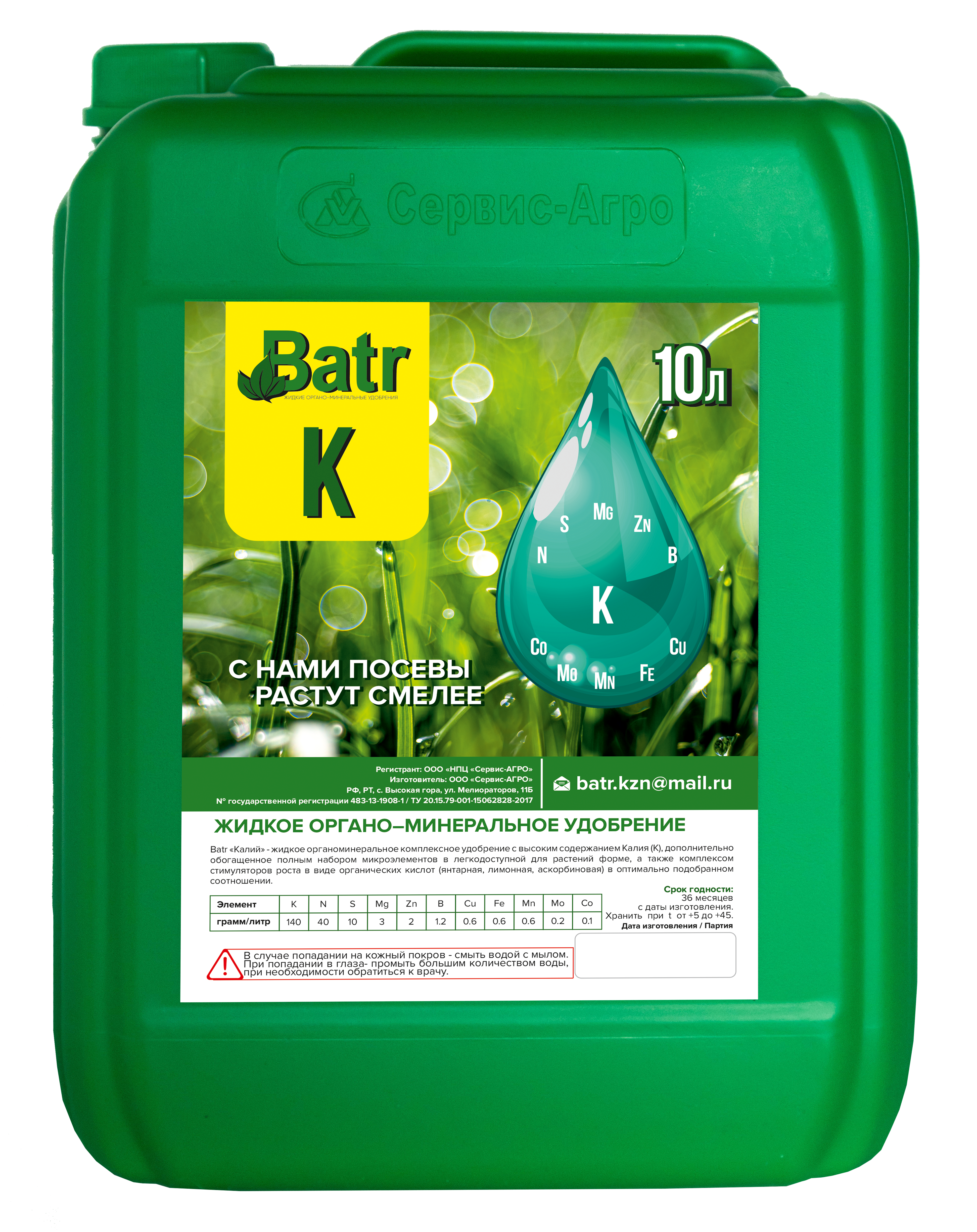 Batr «К» - жидкое органо–минеральное комплексное удобрение с высоким содержанием Калия (К), дополнительно обогащенное полным набором микроэлементов в легко доступной для растений форме, а также комплексом стимуляторов роста в виде органических кислот (янтарная, лимонная, аскорбиновая) в оптимально подобранном соотношении. Совместим со всеми основными группами современных пестицидов и агрохимикатов.