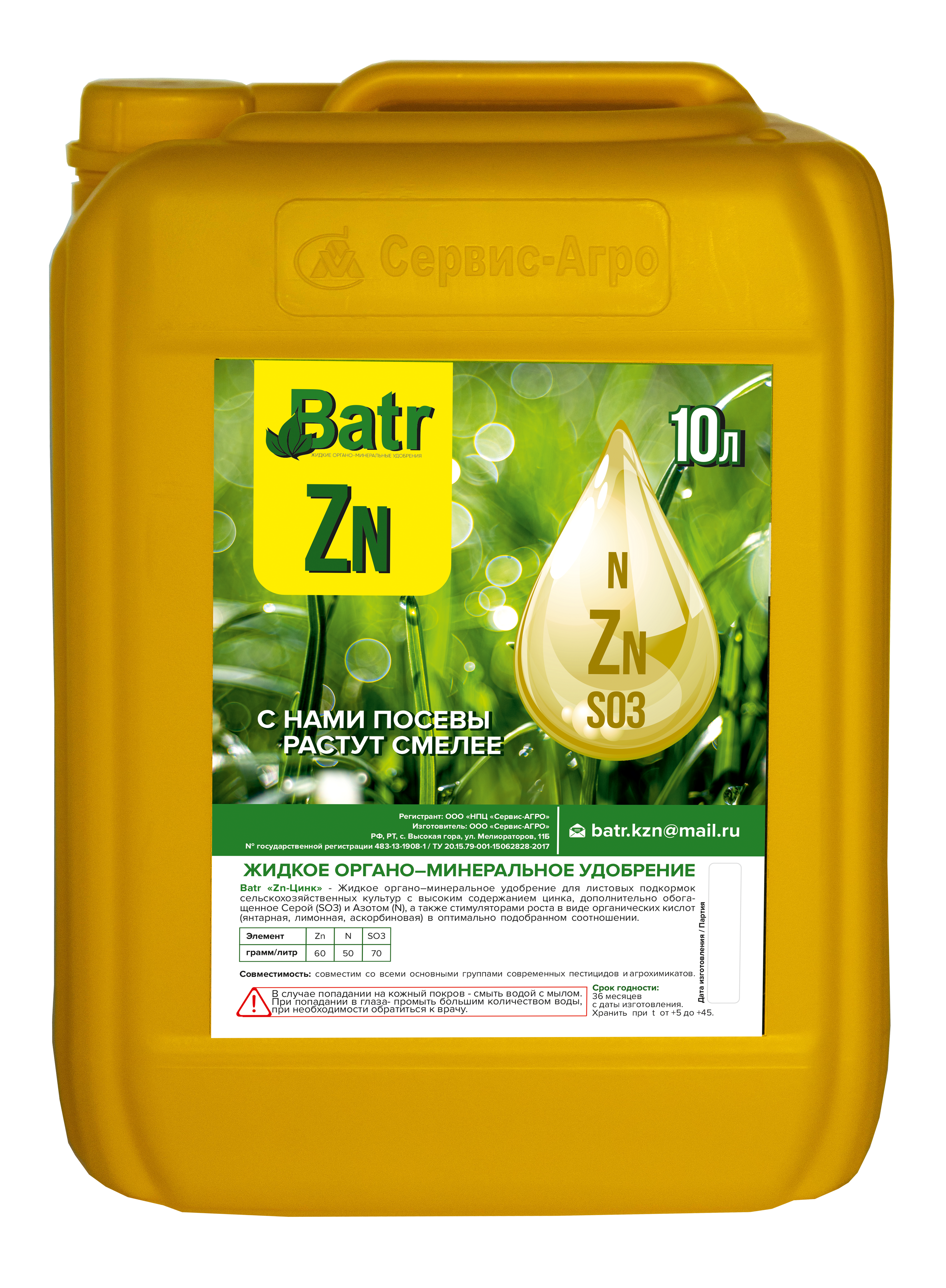 Batr «Zn-цинк» - Жидкое органо–минеральное удобрение для листовых подкормок сельскохозяйственных культур с высоким содержанием цинка, дополнительно обогащенное Серой (SO3) и Азотом (N), а также стимуляторами роста в виде органических кислот (янтарная, лимонная, аскорбиновая) в оптимально подобранном соотношении. Совместим со всеми основными группами современных пестицидов и агрохимикатов.