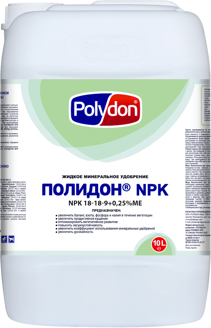 Питательный минеральный комплекс Полидон NPK готов к применению. Используется на всех сельскохозяйственных культурах в критические периоды роста и развития. Жидкий комплекс необходим для устранения дефицита азота, фосфора, калия и достижения определенного направленного эффекта (повышения урожайности и качественных показателей: повышения содержания белка в зерновых и зернобобовых культурах, повышения содержания углеводов в сахарной свекле). Повышает усвоение растениями NPK из почвы.